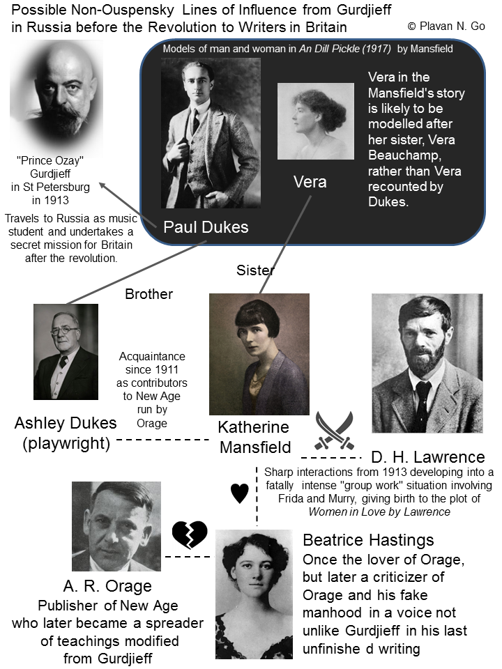 第一次大戦前のサンクト・ペテルスブルグに「プリンス・オゼイ」として身を潜めていたグルジェフに一九一四年に接触していたポール・デュークスが一九一七年にイギリスに一時帰国した際、兄のアシュレイに、オゼイとその教えのこと、それにロシア滞在中に不倫関係にあった年上の女性ヴェラとの関係が破綻に至った自経緯を、ロンドンで居候させてもらった兄のアシュレイに話し、これがマンスフィールドのほかD・H・ローレンスにも伝わったことがうかがわれる。アシュレイは劇作家であり、『ニューエイジ』誌への寄稿を通じてマンスフィールドと知り合っていた。