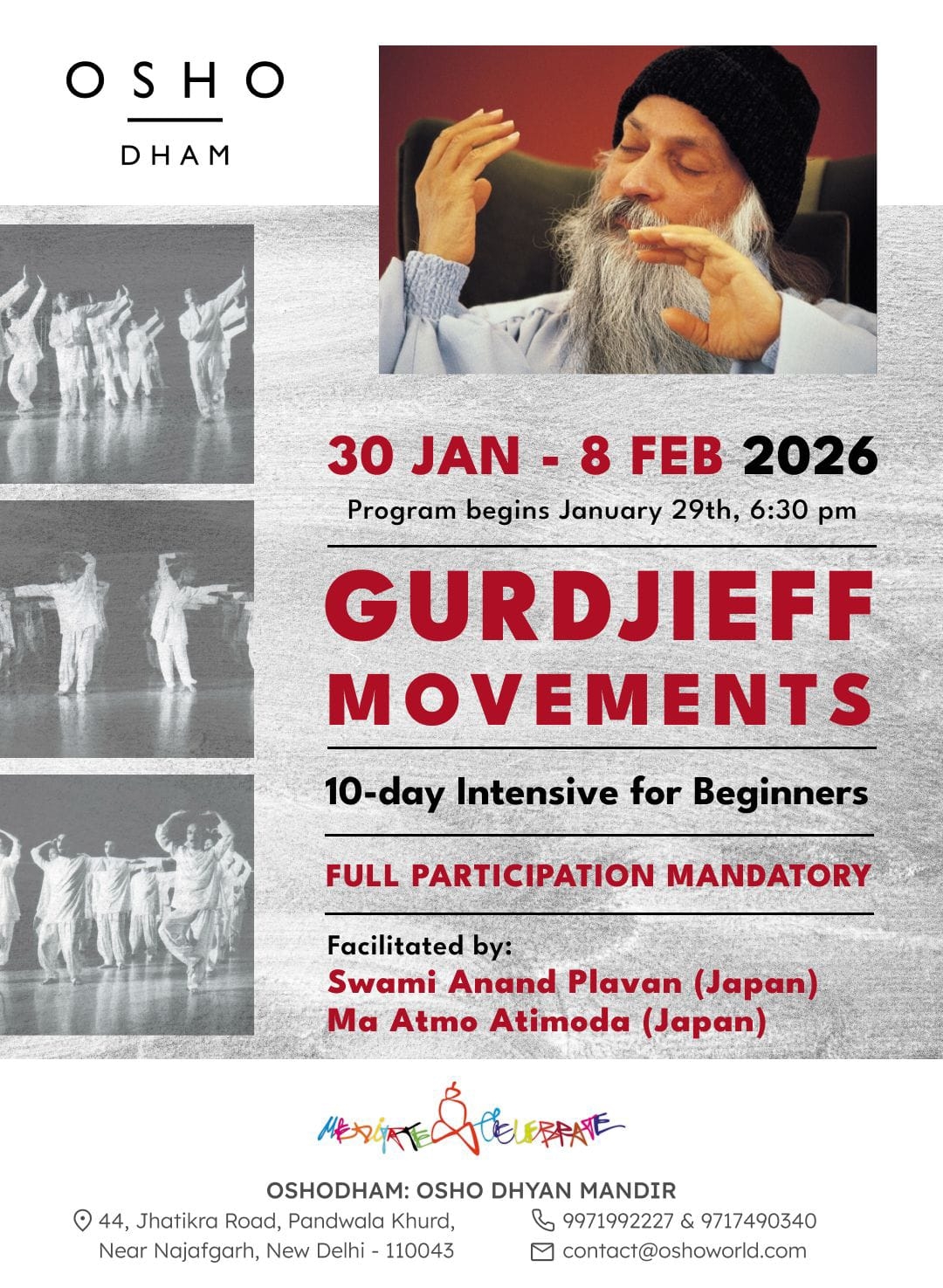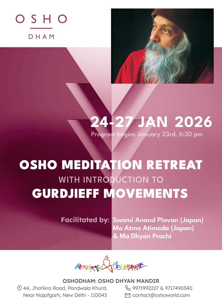 Programs at Osho Dham, India Osho Meditation Retreat Jan. 24 - 27, 2026 Gurdjieff Movements 10-day Intensive for Beginners Jan. 30 - Feb. 8, 2026
