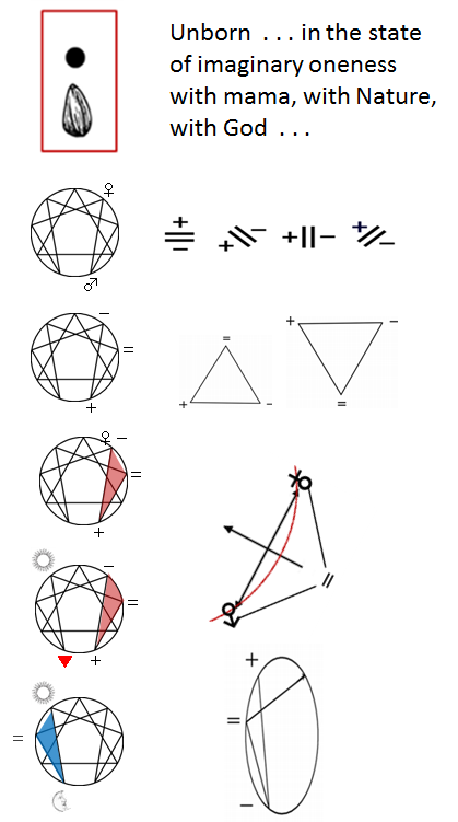 How can such an immature man, a baby immersed in dreams, have a real relationship with a real woman? But one should not have sex with one(s mama or with its substitute. But, such a case of boy's immaturity in sex relationship had become by then a typical case in Britain, feverishly covered by D. H. Lawrence because it was his own case, which he never seemed to have overcome even after Sons and Lovers. The story of a woman-dominated relationship between Birkin and Hermione, which ends violently like in the case of Dukes and Vera, can be inspired by what he heard about them although it must have been his own story too. Lawrence is likely to have been aware of their relationship as Katherine Mansfield evidently was when she wrote A Dill Pickle (1917). A similar case of child-mother type man-woman relationship was repeated by J. G. Bennet with Lady Beaumont of Constantinople, after he found that his relationship with his young wife had become uninteresting after his spiritual awakening, so to say, triggered by his out-of-body experience induced by injury he suffered during the war. I mention this because Bennet is the person about whom Gurdjieff specifically is reported to have said that he had the second body, but not the third, which destines him to remain 'a taxi' without a driver. How poor! How stupid! Gurdjieff, particularly in the chapter of India in Beelzebub's Tales to His Grandson, emphasized the misery of having formed a second body but not the third: Blessed is he who has a soul, blessed is he who has none, but woe and grief to him who has it in embryo. Normally, the second body (=) of a man is crystallized from a sound opposition between the first body (-) and the third body (+), where the first body stands for the body we know, this physical, organic presence of man, while the third body is a body of awareness one may develop in life/