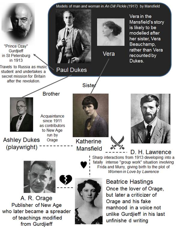 A Dill Pickle (1917) by Katherine Mansfield captures the image of Paul Dukes at the time of his temporary homecoming in 1917 after he finished his relationship with Vera, believing that he has become more developed as an independent man, thanks to his meeting with Prince Ozay and his teaching, but whom he in fact could not follow. This is probably the subtlest of her short stories because of her capturing of all these elements. This story, written ion the base of a story known as An Onion in the Brothers Karamazov, could be taken as a story telling about the impossibility for anyone to save a woman steeped in a kind of negativity typical of woman, addicted to using it as a weapon, because, for such a woman, that negativity is like her soul, her identity, she has nothing else to cling to. In the story, her name is indeed Vera, but this is also the real name of Mansfield's eldest sister, a character who appears as Isabel in some other short stories of Mansfield. The man is evidently modeled after Dukes, and as he indeed looks different from how he was several years ago, more manly, independent, partly as a result of having learnt a certain 'system' while he was in Russia. He sees the negative state in which Vera is, tells stories about his journeys, which tickles her mind, makes her almost want to change the course of her life, but she is not quite trusting, as memories of how he was in the past, keep on bothering her: Has this man really grown up? Could he be in fact the same as before? This mistrust in the possibility of a boy being transformed into a real man might be out of her attachment to her own negativity, could be mostly so, but yet, but she might have been simply seeing him through. She gets up and leaves, butting the onion, which, in this story is suggested by the title and depicted by her glove, with which the man tries to pull her back. Bye, bye. The man hurriedly tries to tell her about the system he had learned, with which he might save her. No, he did not get to the point of telling her about Ozay. Well, it this was indeed the case of Dukes, what's good in telling her about Ozay and his teaching as he himself had lost connection with it. He had let go of the onion.