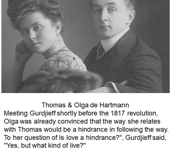 The Hartmanns left Gurdjieff in 1930, never to see him again. To Louise March who replaced them as a new German secretary, soon to be nicknamed Sausage, Gurdjieff told how they had been terrible, stubborn, insolent. Dr. Stjoernval, a longtime associate of Gurdjieff, commented: 'May I say something to you? How to explain it? Gurdjieff tries something that no one has tried. He tries to take a person born under one star and change their destiny to that corresponding to another constellation. And that is, in general, impossible.' (From Louise March, The Gurdjieff Years) This story about the Hartmanns was in focus in my first meeting in 1988 who KM who had been related with the main lineage of transmission from Gurdjieff. The Japanese woman, who had spent years in Ney York with a Foundation group there, was preparing to publish the Japanese translation of the memoir written by the Hartmanns, and Mr. W of the publisher that had been publishing many books of Osho and a few of Gurdjieff was also in the meeting. I was surprised to hear Mr. W's mistrustful remarks on Gurdjieff:. "I would never want to follow a man like this, Will you," he asked me. "I think I will," I said. Then, Mr. W asked KY, "Are there stimm some group leaders in the Foundation who can have such an impact on the lives of the group members." "Such ones have already ceased to exist," KY said, then turned to me, bonbarded me with criticisms, and told me that unless I get totally transformed through meeting with a living master, I should not think of something like translating Gurdjieff's books. But, where is such a place now? Then, Mr, W mentioned Osho, expressing his appalment about how much risks his sannyasins take in following him. KY, said, "Yes, he could be equivalent, although he is vulgar." Then, I spent years in the Commune in Pune that had been formed around Osho, but when I went there, I initially did not know that I was going to be involved in the reviving of Gurdjieff's Movements there. There, at that time, the energy level was so high that one could feel uncomfortable spending a long time there as it was too revealing. My first marriage did not endure for a month. It is difficult to deny that the formation of such a space depended largely on the use of what could be close to fraudulence. However, in this case, the fraudulence was more or less deliberate, out of necessity, and Osho seems to have suffered and perished from its consequences. In most of us this common language I speak about is irretrievably lost. The only thing left us is to establish a connection in a roundabout, "fraudulent" way. (Gurdjieff, January 19, 1923) By misrepresenting all masters of the past including Gurdjieff, speaking as if on behalf of them, and bringing together different approaches, that merged and collided around him, he created around him a huge communal phenomenon, a melting pot, in which one could die and get reborn., Today, when it is gone, you are unlikely to see its benefits, but I received the maximum benefits and impacts from it while it lasted, so I am not personally in a position to condemn the harms although I understand the position of the criticizers. Plavan N. Go |